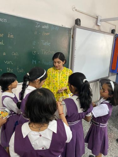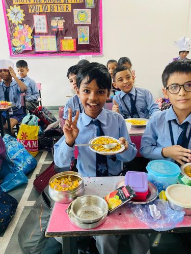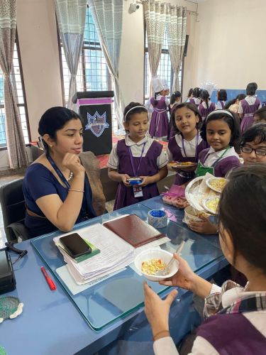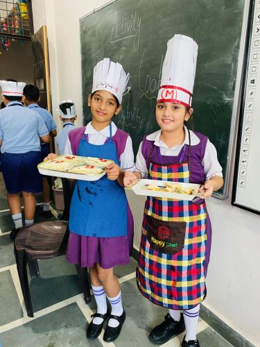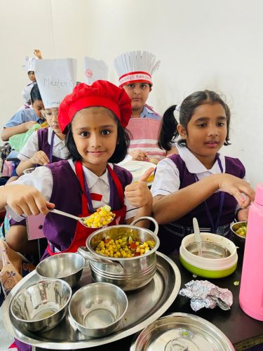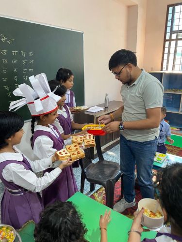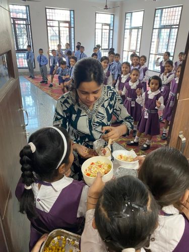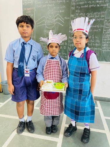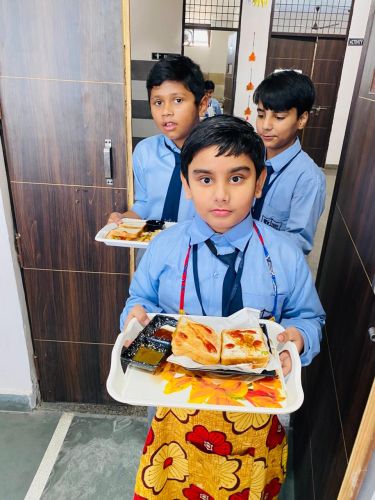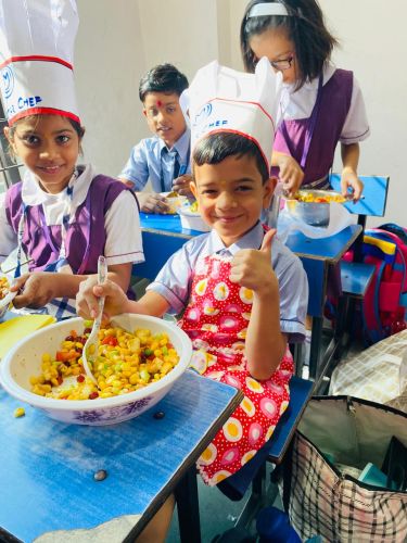 The activity brought out the little chefs of Classes III to V, who prepared delightful dishes with great enthusiasm. Class III made Sweet Corn Chaat, Class IV prepared Bhel Puri Chaat, and Class V prepared sandwiches. Wearing chef caps and aprons, the students worked in teams, showcasing their creativity, teamwork, and confidence. They offered their dishes to the admin staff, teachers, and support staff, who appreciated the delicious flavors and thoughtful presentation.