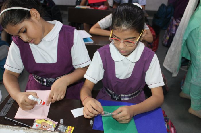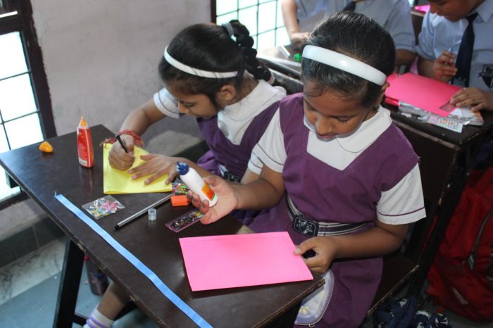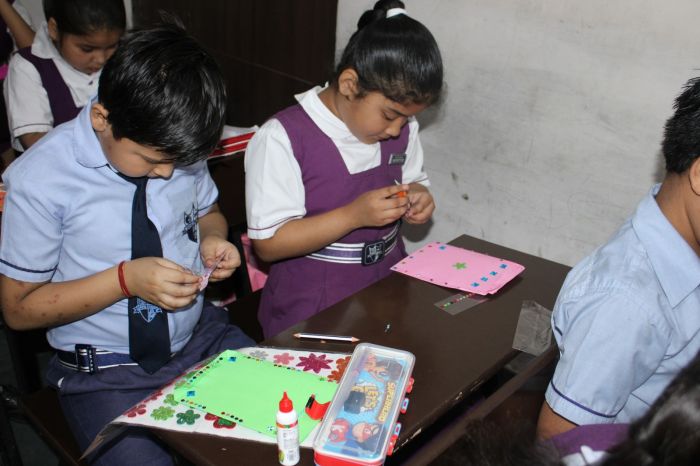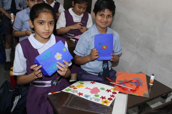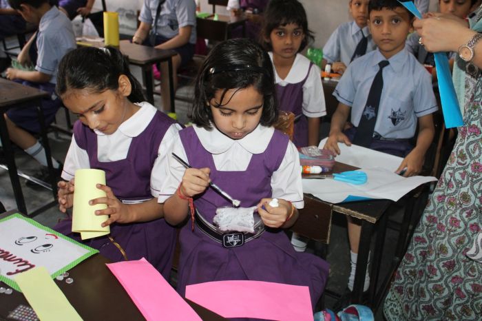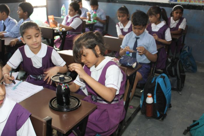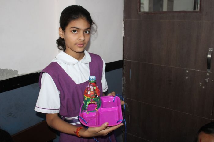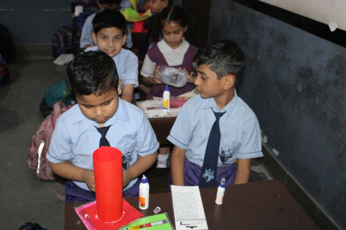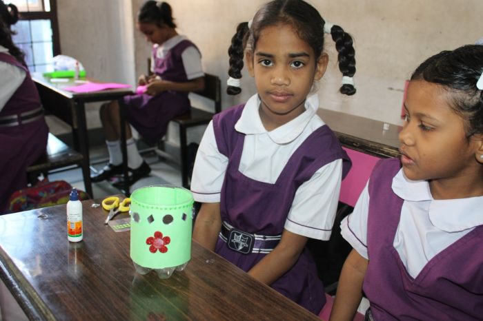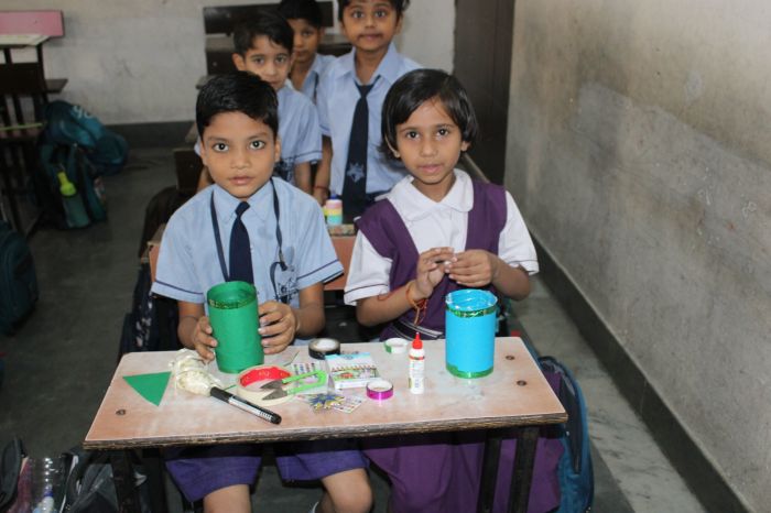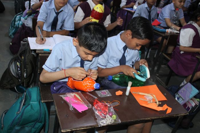 Students in Class III created pencil/pen holders from discarded plastic bottles, learning about waste reduction and recycling.